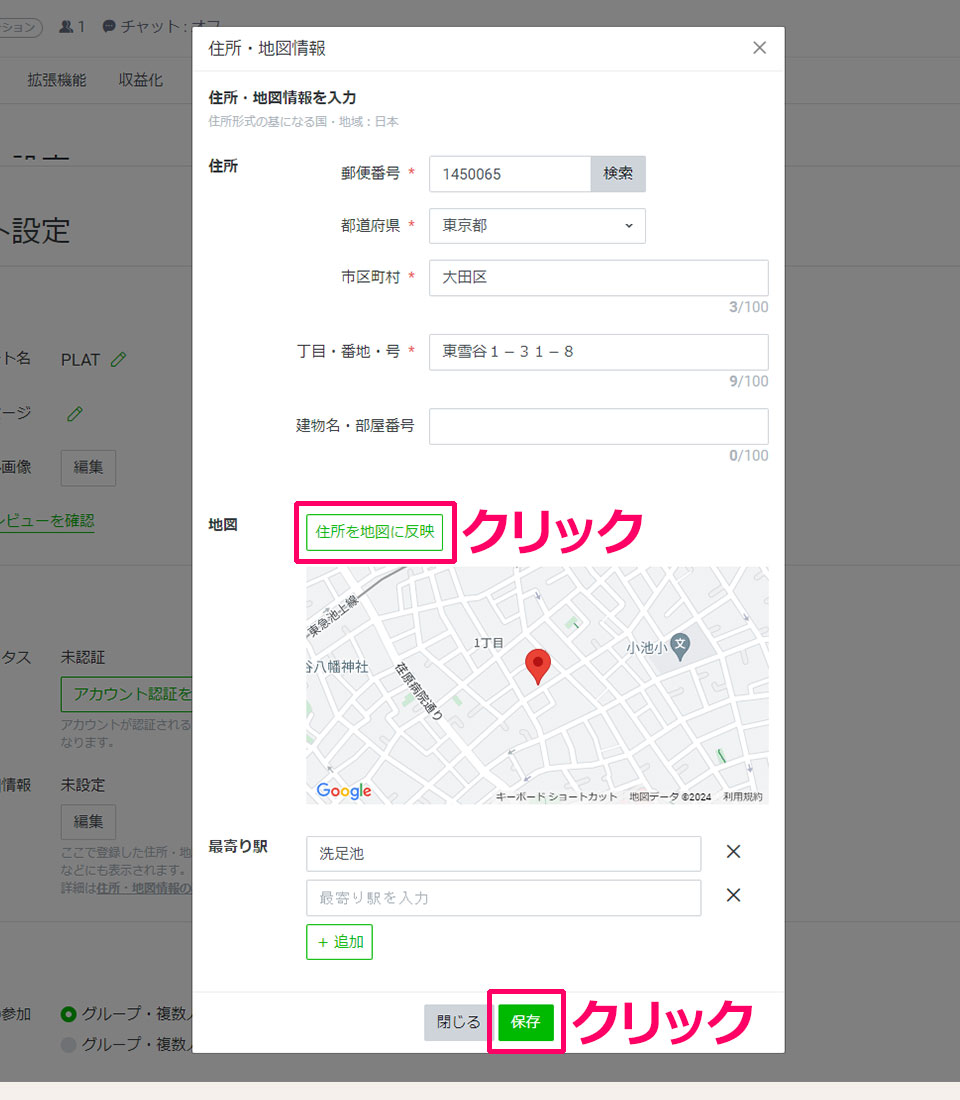 郵便番号や住所等を入力したら「住所を地図に反映」をクリックし、マーカーの位置を調整したら「保存」をクリックすると住所が登録されます。(入力内容は当社の場合ですので適宜変更して下さい)