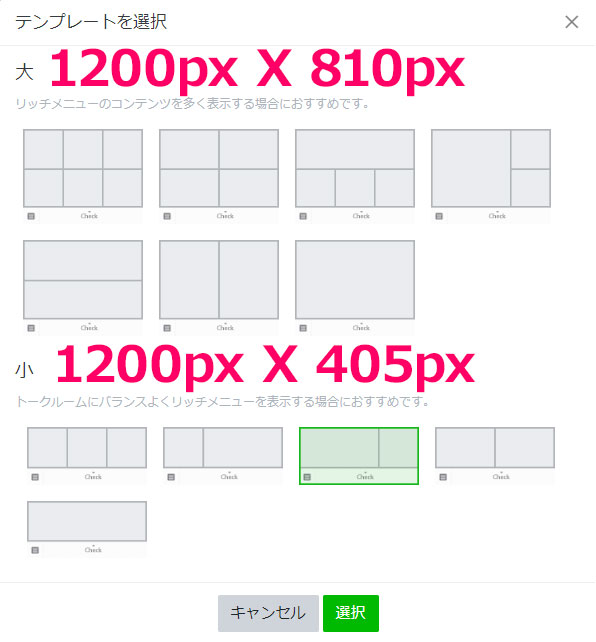 設定したいデザインを選び、その際表示される幅や高さのサイズをメモしておき「選択」をクリックします。等分のデザインではなく、1つだけ大きなサイズのデザインが良いかと思います。大きさなサイズのところに一番クリックしてもらいたいリンクを設定します。